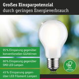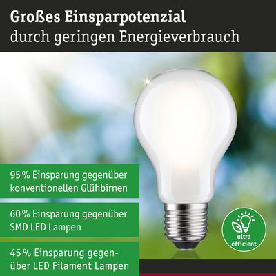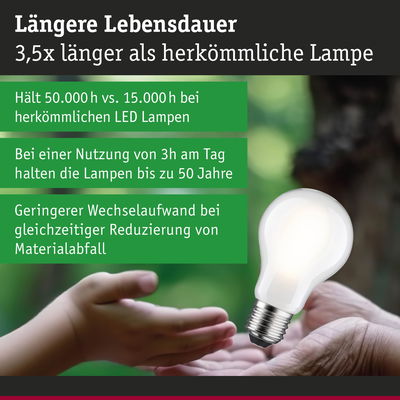 Die ultra-effizienten LED-Leuchtmittel der LED Eco-Line verbinden innovative Technik mit Nachhaltigkeit und sorgen für eine effiziente und stilvolle Beleuchtung. Dank des 60 % niedrigeren Energieverbrauchs und der deutlich längeren Lebensdauer gegenüber Standard LED-Lampen, lassen sich die Energiekosten erheblich senken und ganz nebenbei noch die Umwelt schonen. Die matte Filament LED Birne passt in jede handelsübliche E27 Fassung und schafft mit 3000K, einer Leistung von 8,2W ein angenehm warmweißes Licht ohne Grünstich. Selbst große Lampenschirme werden gleichmäßig ausgeleuchtet, wodurch jeder Raum in ein harmonisches Wohlfühlambiente verwandelt wird. Je nach individuellem Bedarf lässt sich die Helligkeit des Leuchtmittels in 3 Stufen über einen handelsüblichen Lichtschalter dimmen. Der Dimmer verfügt über eine Memory Funktion. Die Paulmann LED-Lampen mit Eye friendly-Siegel bieten augenschonendes und komfortables Licht. Ob beim Arbeiten, Lesen oder Entspannen, die Lampen tragen zu bestem Sehkomfort bei.
