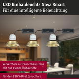 16 Millionen Farben, 16 Millionen Lichtstimmungen - Das smarte Einbauleuchten Set Nova Coin in Gold matt mit Farbwechselfunktion schafft in jedem Raum ein individuelles Wohnambiente. Im Lieferumfang sind drei austauschbare LED-Leuchtmittel inklusive hochwertigen Alu-Einbauringen enthalten. Mit einer Leistung von 3x6 Watt und RGBW-Zigbee 3.0-Steuerung sorgen sie für eine effiziente und innovative Beleuchtungslösung. Zigbee 3.0 ist ein Funkübertragungsprotokoll, das Geräte verschiedener Hersteller miteinander vernetzt. So lassen sich die Leuchten per App, Fernbedienung oder Sprachbefehl einzeln oder gemeinsam steuern: Ob gemütliches warmes Goldlicht (2200K), sachlich helles Tageslichtweiß (6500K) oder bunte Farbverläufe - die Kombination aus Tunable White, RGB und Dimmfunktion bietet unzählige Möglichkeiten. Einfach und bequem sind die smarten Einbauleuchten weiterhin über einen handelsüblichen Lichtschalter ein- und ausschaltbar. Der integrierte Memory-Effekt merkt sich dabei immer die zuletzt genutzte Lichteinstellung - für maximalen Komfort. Durch die Schwenkbarkeit der Leuchten lässt sich das Licht überall dort hinlenken, wo es benötigt wird. Die Montage gestaltet sich dank der verkettbaren und austauschbaren Coins, der geringen Einbautiefe von nur 45 mm und dem 230-V-Direktanschluss besonders einfach und effizient.