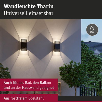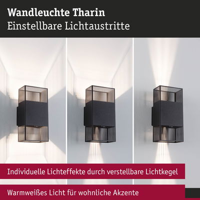 Mit ihrem faszinierenden Lichteffekt durch die cut-outs von Linien wird die Wandleuchte Tharin in der Farbe Schwarz zu einem echten Hingucker im Innen- und Außenbereich. Sie ist mit 2x3,7W festverbautem LED-Leuchtmitteln bestückt und eignet sich durch ihre geringe Aufbautiefe insbesondere für die Beleuchtung im Flur und dem Treppenaufgang. Dank des IP44-Schutzes und der Verwendung von hochwertigem rostfreien Edelstahl kann die Wandleuchte Tharin nicht nur in allen Innenräumen, sondern ebenso im Badezimmer, auf dem Balkon und an der Hauswandmontiert werden. Die unabhängig voneinander verstellbaren Lichtkegel nach oben und unten ermöglichen individuelle Lichteffekte, die jeder Umgebung eine beeindruckende Atmosphäre verleihen. Dabei sorgt die Wandleuchte mit einer Farbtemperatur von 3000K für eine gemütliche Beleuchtung. Hochwertige Komponenten garantieren eine lange Lebensdauer von mind. 30.000 Stunden. Der innovative Montagestecker QuickPlug ermöglicht eine zeitsparende Installation dank einfachem Stecksystem.