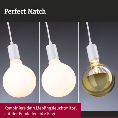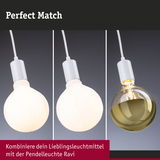 Der Mix & Match Look ist absolut im Trend und ermöglicht das Zuhause mit einem besonderen Blickfang zu verschönern. Die moderne Pendelleuchte Ravi in Weiß matt ist ein perfekter Beweis dafür. Mit ihrem minimalistischen, modernen Design und der attraktiven Farbkombination wird sie zu einem echten Highlight im Zuhause. Kombiniert mit den dekorativen Leuchtmitteln von Paulmann entsteht ein perfektes Set. Besonders harmonisch sieht die Leuchte in Kombination mit Leuchtmitteln aus den Serien White Lampion oder Metallic Glow aus. Alternativ lassen sich Leuchtmittel mit E27-Sockel bis max. 60 Watt verwenden. Dank des IP44-Schutzes kann die Wandleuchte Ravi selbst im Bad verwendet werden.