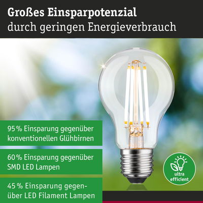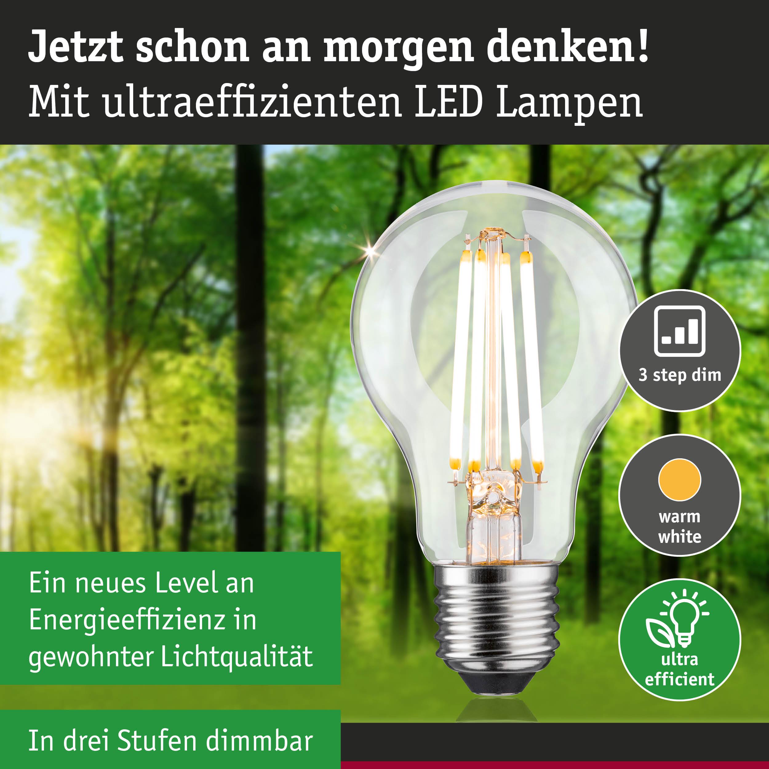 Die ultra-effizienten LED-Leuchtmittel der Eco-Line verbinden innovative Technik mit Nachhaltigkeit und sorgen für eine effiziente und stilvolle Beleuchtung. Dank des 60 % niedrigeren Energieverbrauchs und der deutlich längeren Lebensdauer gegenüber Standard LED-Lampen, lassen sich die Energiekosten erheblich senken und ganz nebenbei noch die Umwelt schonen. Die klare Filament LED Birne passt in jede handelsübliche E27 Fassung und schafft mit 3000K, einer Leistung von 2,5W und 470lm ein angenehm warmweißes Licht ohne Grünstich. Selbst große Lampenschirme werden gleichmäßig ausgeleuchtet, wodurch jeder Raum in ein harmonisches Wohlfühlambiente verwandelt wird. Je nach individuellem Bedarf lässt sich die Helligkeit des Leuchtmittels in 3 Stufen über einen handelsüblichen Lichtschalter dimmen. Der Dimmer verfügt über eine Memory Funktion. Die Paulmann LED-Lampen mit Eye friendly-Siegel bieten augenschonendes und komfortables Licht. Ob beim Arbeiten, Lesen oder Entspannen, die Lampen tragen zu bestem Sehkomfort bei.