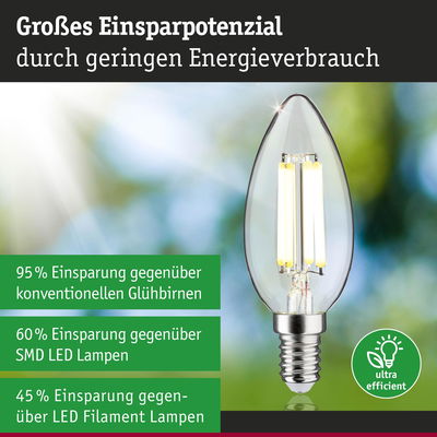 Die ultra-effizienten Leuchtmittel der Eco-Line verbinden Innovation mit Nachhaltigkeit. Durch den 60 % niedrigeren Energieverbrauch und der deutlich längeren Lebensdauer gegenüber Standard LED-Lampen lassen sich die Energiekosten deutlich senken und ganz nebenbei noch die Umwelt schonen. Das kerzenförmige Leuchtmittel mit 4000K, einer Leistung von 2,5W und 525lm schafft ein angenehm gleichmäßiges Licht ohne Grünstich. Kerzenlampen eignen sich durch ihre schmale Bauform besonders für den Einsatz in Lüstern, Wand- und Deckenleuchten und sorgen mit ihrem angenehmen Licht für eine Wohlfühlatmosphäre in den eigenen vier Wänden. Die Lampe passt in jede handelsübliche E14 Fassung.