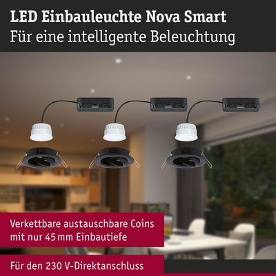 16 Millionen Farben, 16 Millionen Lichtstimmungen - Das smarte Einbauleuchten Set Nova Coin in Schwarz matt mit Farbwechselfunktion schafft in jedem Raum ein individuelles Wohnambiente. Im Lieferumfang sind drei austauschbare LED-Leuchtmittel inklusive hochwertigen Alu-Einbauringen enthalten. Mit einer Leistung von 3x6 Watt und RGBW-Zigbee 3.0-Steuerung sorgen sie für eine effiziente und innovative Beleuchtungslösung. Zigbee 3.0 ist ein Funkübertragungsprotokoll, das Geräte verschiedener Hersteller miteinander vernetzt. So lassen sich die Leuchten per App, Fernbedienung oder Sprachbefehl einzeln oder gemeinsam steuern: Ob gemütliches warmes Goldlicht (2200K), sachlich helles Tageslichtweiß (6500K) oder bunte Farbverläufe - die Kombination aus Tunable White, RGB und Dimmfunktion bietet unzählige Möglichkeiten. Einfach und bequem sind die smarten Einbauleuchten weiterhin über einen handelsüblichen Lichtschalter ein- und ausschaltbar. Der integrierte Memory-Effekt merkt sich dabei immer die zuletzt genutzte Lichteinstellung - für maximalen Komfort. Durch die Schwenkbarkeit der Leuchten lässt sich das Licht überall dort hinlenken, wo es benötigt wird. Die Montage gestaltet sich dank der verkettbaren und austauschbaren Coins, der geringen Einbautiefe von nur 45 mm und dem 230-V-Direktanschluss besonders einfach und effizient.