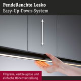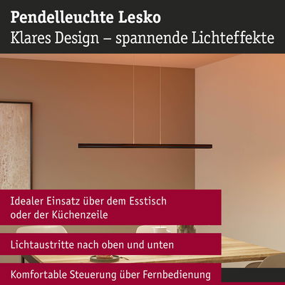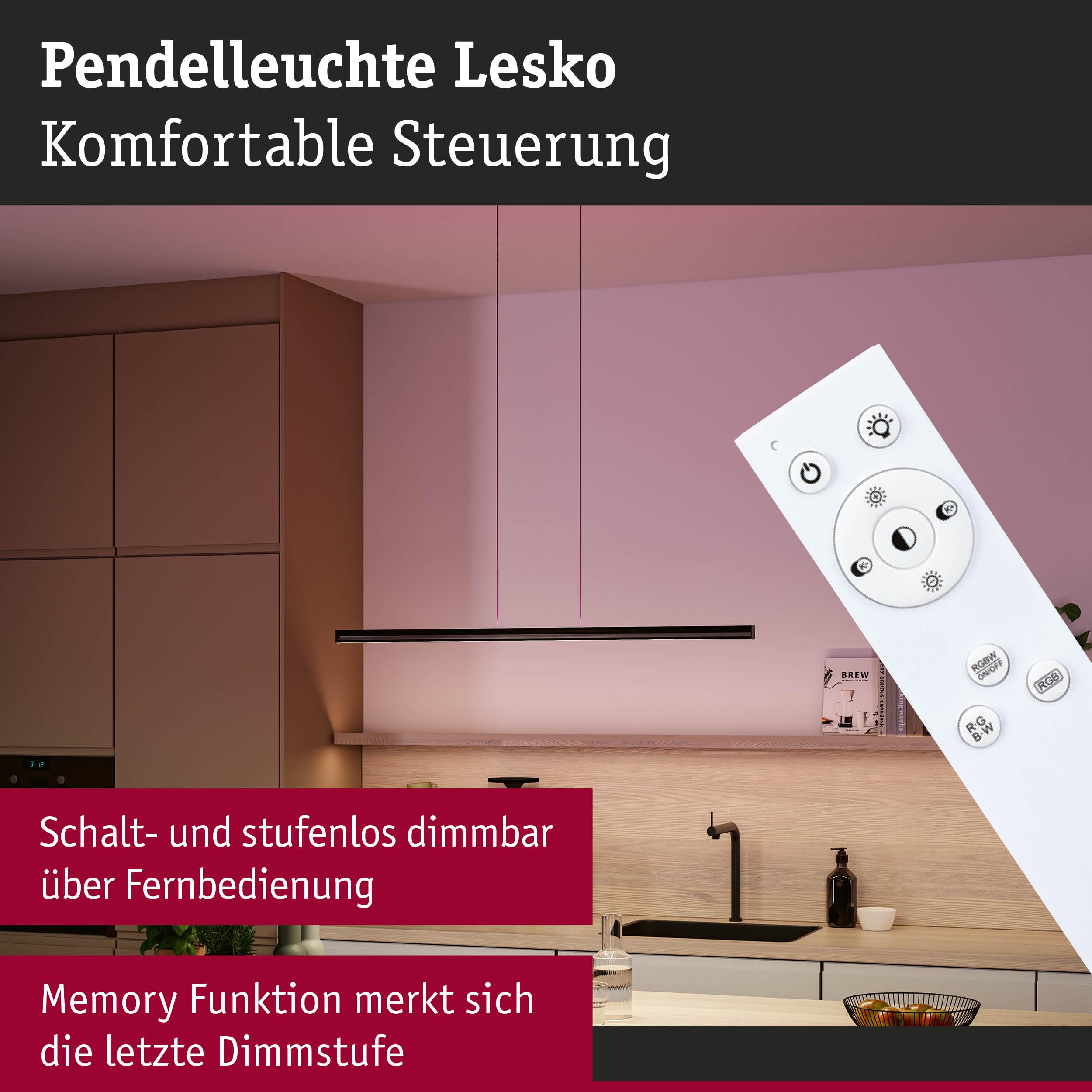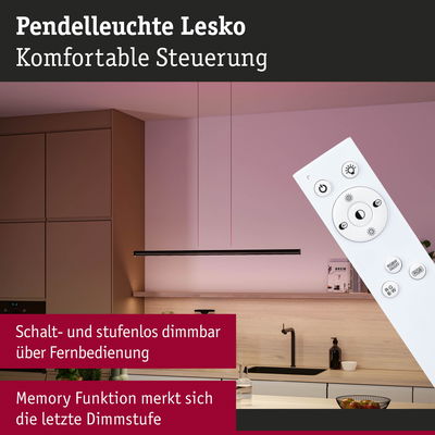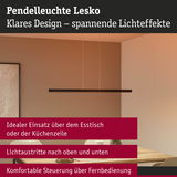 Die Pendelleuchte Lesko eignet sich ideal für die Beleuchtung an Esstischen, Küchenzeilen oder am Arbeitsplatz und sorgt dank des separat schaltbaren Lichtaustritts nach oben und unten für maximale Flexibilität an individuellen Lichtstimmungen. Nach oben ist von einfarbiger Dauerbeleuchtung bis hin zu farbigen Lichteffekten alles möglich. Neben der effektvollen Farbbeleuchtung, kann außerdem ein warmweißes Licht mit 3000K für ein wohnliches Ambiente gewählt werden. Nach unten lässt sich die Lichtfarbe dank der intelligenten Weißlichtsteuerung Tunable White stufenlos einstellen und dimmen - von warmweißer Entspannungsbeleuchtung bis hin zu tageslichtweißem Arbeitslicht (2700 K - 6500K). Die integrierte Memoryfunktion speichert dabei die zuletzt gewählten Lichteinstellungen bis zum nächsten Einschalten. Mit der im Lieferumfang enthaltenen Fernbedienung können die beiden Lichtaustritte separat gesteuert werden. Das schlichte Design der Pendelleuchte in Schwarz matt fügt sich harmonisch in verschiedene Wohnstile ein. Mit dem “Easy Up-and-Down” Prinzip lässt sich die Pendellänge an dem filigranen Kabel ganz einfach und ohne Werkzeug beliebig anpassen.