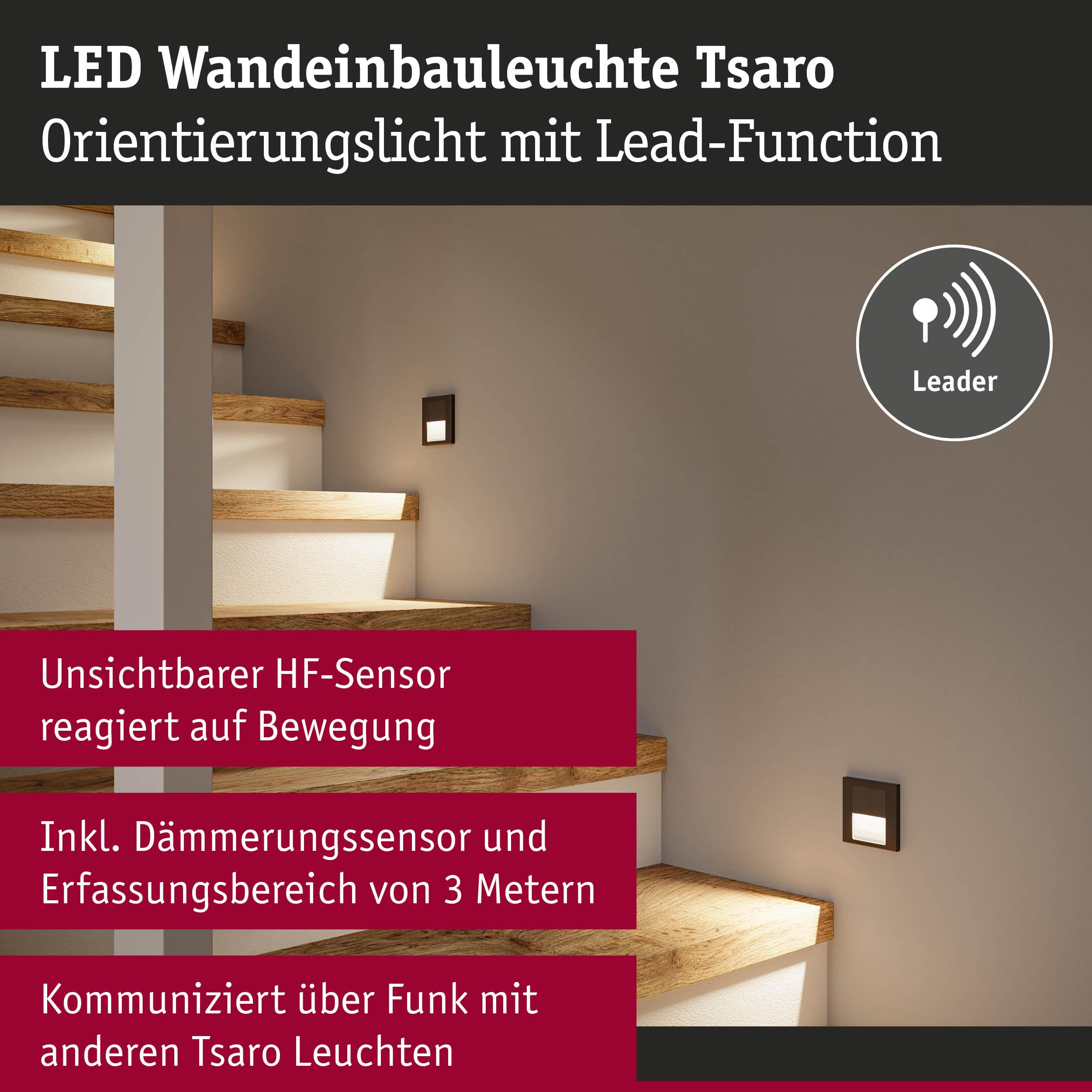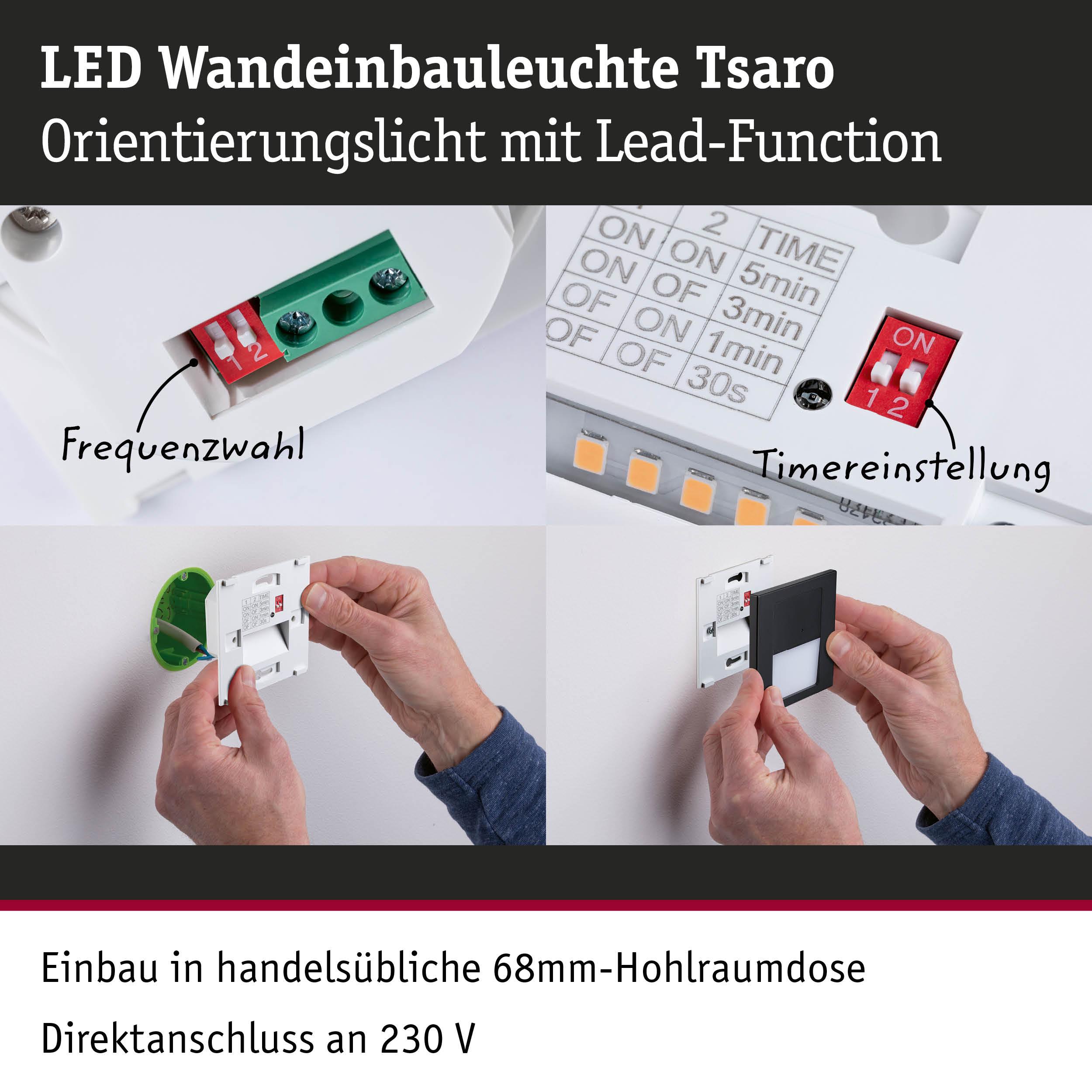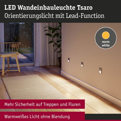 Die Wandeinbauleuchte Tsaro in Schwarz matt mit Lead-Funktion eignet sich ideal als Orientierungslicht und erhöht durch automatisches Schalten die Sicherheit in Fluren, Treppen oder Laufwegen. Mit der innovativen „Lead“ und „Follower“-Funktion wird eine energieeffiziente Steuerung ermöglicht. In einem System werden dabei sowohl sogenannte „Lead“ als auch „Follower“ Leuchten zusammengeschaltet. Die Leuchten mit Lead-Funktion verfügen über einen Dämmerungs- sowie einen integrierten Hochfrequenz-Sensor, der Bewegungen auf bis zu 3 Meter zuverlässig erfasst und ein Signal an alle Tsaro Leuchten derselben Frequenz sendet. Die Leuchten mit Follower-Funktion können dieses Funksignal empfangen und sich synchron schalten. Das warmweiße Licht mit einer Farbtemperatur von 2700K und einer Leistung von 1 Watt erlischt automatisch, wenn es nicht genutzt wird und aktiviert sich, sobald die Lead-Leuchte Bewegung wahrnimmt. Je nach individuellem Bedarf kann aus unterschiedlichen Zeitintervallen gewählt werden: 30 Sekunden, 1 Minute, 3 Minuten oder bis zu 5 Minuten. Für ein augenschonendes und blendfreies Licht sorgt die Diffusor-Blende, bei der zwischen einer glatten und strukturierten Oberfläche gewählt werden kann. Die Bauweise der Wandeinbauleuchte Tsaro ist für Standard-Unterputzdosen mit einem Durchmesser von 68mm optimiert und lässt sich daher besonders einfach installieren. Ein zusätzlicher Trafo wird nicht benötigt, da die Leuchten direkt am 230V Anschluss montiert werden können.