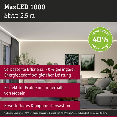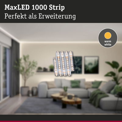 Der warmweiße MaxLED 1000 LED Strip ist die ideale Wahl für eine moderne und besonders energieeffiziente Beleuchtungslösung. Im Vergleich zu herkömmlichen Leuchten benötigt der LED Strip 40 % weniger Energie, bei gleichem Lichtoutput. Der Strip eignet sich hervorragend für den Einsatz in Profilen und ist mit 18 Watt und 1100lm/m so leistungsstark, dass er problemlos zur Raumausleuchtung eingesetzt werden kann. Die Farbtemperatur von 2700K sorgt für ein gemütliches und blendfreies Licht- ideal für die Beleuchtung in Wohnzimmern, Küchen oder Schlafzimmern. Um jederzeit die gewünschte Lichtstimmung zu kreieren, lässt sich die Helligkeit flexibel dimmen. Mit einer Schere kann der Strip ganz einfach gekürzt werden und erleichtert so die Anpassung an individuelle Raumbegebenheiten. Da der Strip problemlos an Möbel, Regale oder Wände angebracht werden kann, eröffnen sich vielfältige Gestaltungsoptionen.