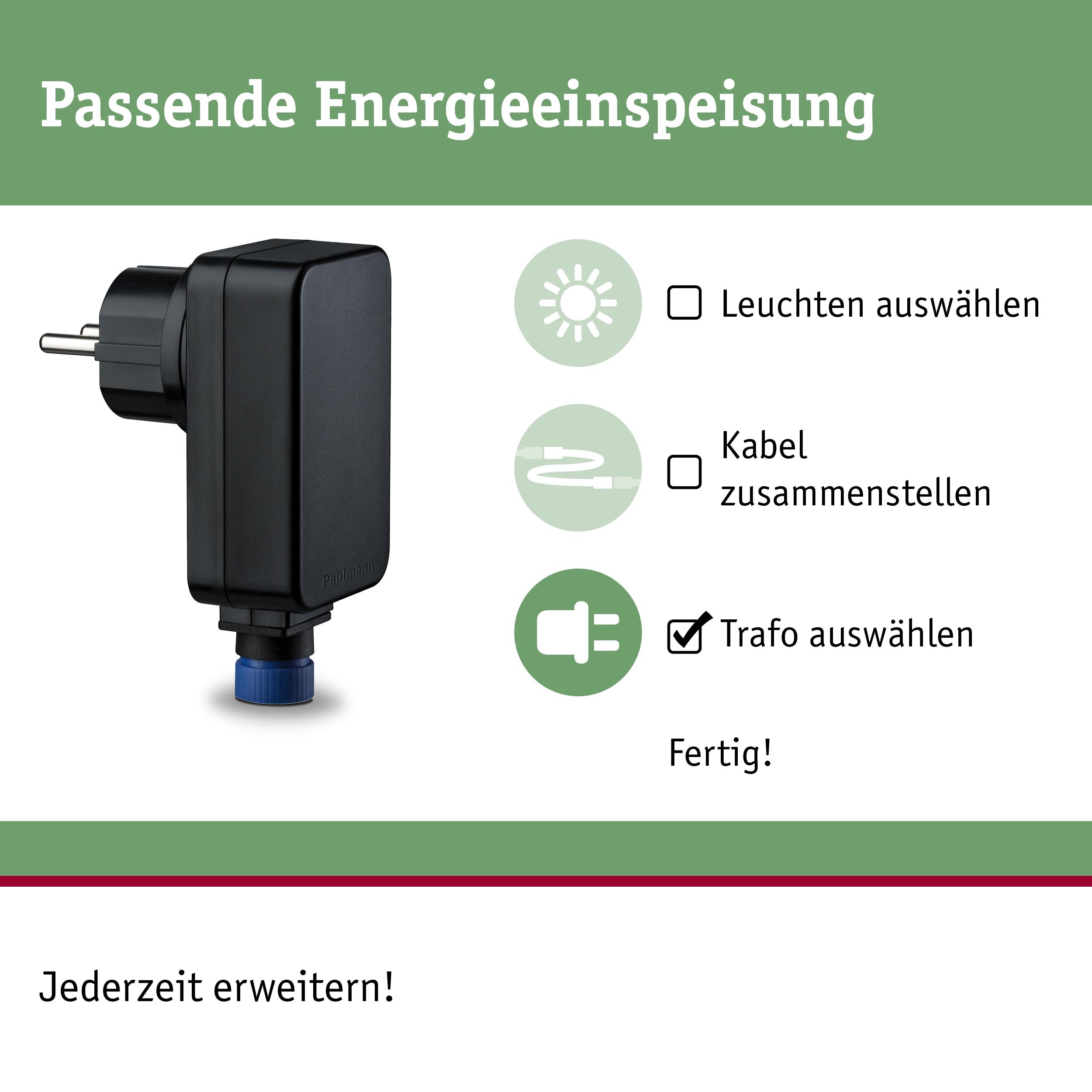 Der Plug & Shine Trafo mit max. 21W ist die Basis einer Outdoor-Lichtinstallation rund um Haus, Terrasse und Garten. Je nach eigenem Wunsch können verschiedenste Plug & Shine Leuchten und Verbinder bis zu einer maximalen Systemlänge von 50 Metern kombiniert werden.