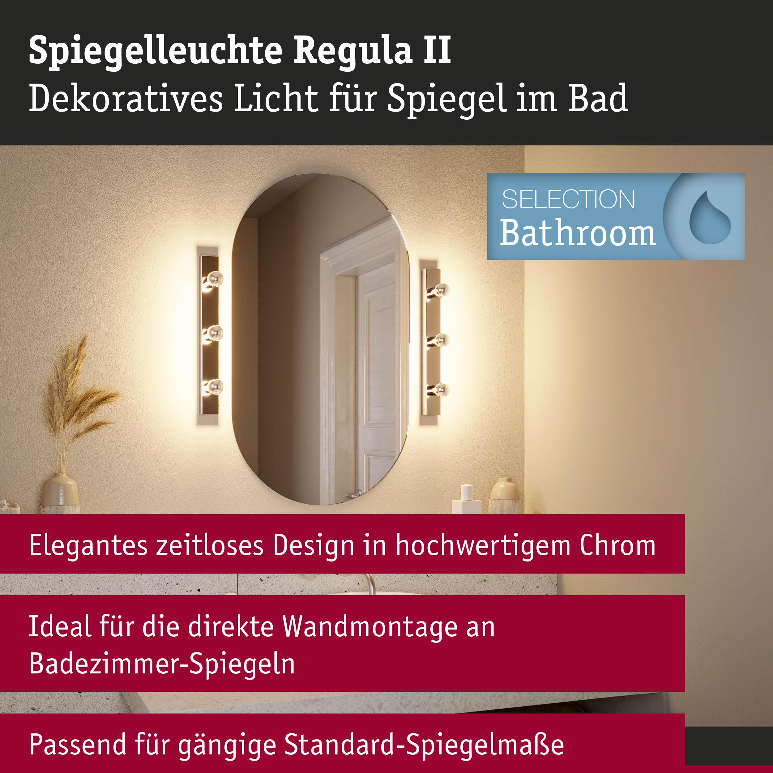 Strahlend schön – die ideale Beleuchtungslösung fürs Badezimmer. Dieses praktische Set enthält die Regula II Lichtleiste in Chrom, Kopfspiegel Silber inklusive passender Kopfspiegelleuchten. Durch ihren besonders hohen IP-Schutz von IP44 ist die 3-flammige Regula II Lichtleiste vor Spritzwasser geschützt und eignet sich daher ideal für den Einsatz im Badezimmer oder anderen Feuchträumen. Mit ihrem modernen und cleanen Design ist sie universell in verschiedenen Einrichtungsstilen einsetzbar. Die Länge von 45 cm ist an Standard-Spiegelmaße angepasst und eignet sich auch besonders gut für kleinere Spiegel, die häufig in Gäste-WCs zu finden sind. Im Lieferumfang sind 3 Kopfspiegel Tropfenlampen in Chrom, Kopfspiegel Silber enthalten, die für einen glamourösen Hollywood-Schminkspiegel-Look sorgen! Mit einer Leistung von je 3x4,8W geben sie ihr warmweißes Licht in alle Richtungen ab. Dabei lässt sich die Helligkeit nach individuellem Bedarf dimmen. Die Installation der Regula II gestaltet sich denkbar einfach: Sie kann über oder neben dem Spiegel an der Wand montiert werden. Nach dem Eindrehen der Kopfspiegel Tropfenlampen oder anderen gewünschten Leuchtmitteln mit E14 Fassung ist sie sofort betriebsbereit. Einer angenehmen Lichtatmosphäre im Badezimmer steht so nichts mehr im Weg. Zur Reinigung der Leuchten eignet sich am besten ein weiches Tuch – auf die Verwendung eines Mikrofasertuches sollte verzichtet werden. Je nach verwendetem Leuchtmittel, ist die Lampe dimmbar.