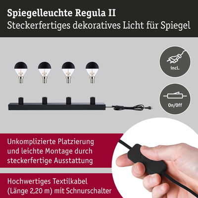 Strahlend schön – die ideale Beleuchtungslösung fürs Badezimmer. Dieses praktische Set enthält die Regula II Lichtleiste in Schwarz/Kopfspiegel Schwarz matt inklusive 4 passenden Kopfspiegelleuchten. Die 4-flammige Spiegelleuchte wird mit einem praktischen Textil-Kabelschalter geliefert, sodass die Montage zum Kinderspiel wird. Dabei wird nur eine Steckdose benötigt, ein Stromauslass an der Wand ist nicht weiter erforderlich. Mit ihrem modernen und cleanen Design in fügt sie sich harmonisch in verschiedene Einrichtungsstile ein und ist optisch sowohl am Schminktisch als auch im Flur ein echter Hingucker. Die Länge von 60 cm ist an Standard-Spiegelmaße angelehnt. Im Lieferumfang sind 4 Kopfspiegel Tropfenlampen in Schwarz/Kopfspiegel Schwarz matt enthalten, die für einen glamourösen Hollywood-Schminkspiegel-Look sorgen! Mit einer Leistung von je 4x2,5W geben sie ihr warmweißes Licht in alle Richtungen ab. Dabei lässt sich die Helligkeit nach individuellem Bedarf dimmen. Die Installation der Regula II gestaltet sich denkbar einfach: Sie kann über oder neben dem Spiegel an der Wand montiert werden. Nach dem Eindrehen der Kopfspiegel Tropfenlampen oder anderen gewünschten Leuchtmitteln mit E14 Fassung ist sie sofort betriebsbereit. Einer angenehmen Lichtatmosphäre im Badezimmer steht so nichts mehr im Weg. Zur Reinigung der Leuchten eignet sich am besten ein weiches Tuch – auf die Verwendung eines Mikrofasertuches sollte verzichtet werden.