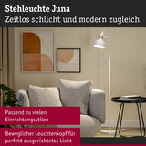 Mit ihrer zeitlosen und zugleich modernen Form- und Designsprache passt die Leuchtenserie Juna in unterschiedlichste Einrichtungsstile und setzt attraktive Lichtakzente im Wohnbereich. Nach Belieben lassen sich die aufeinander abgestimmten Tisch- Steh- und Pendelleuchten der Serie harmonisch miteinander kombinieren. Die weiß matte Stehleuchte mit ästhetischen Farbakzenten in Champagnergold ist vielseitig einsetzbar und eignet sich ideal als Zusatzbeleuchtung neben dem Bett, für die gemütliche Leseecke oder neben dem Sofa im Wohnbereich. Ihre hochwertige Verarbeitung sorgt nicht nur für eine ansprechende Optik, sondern auch für eine lange Lebensdauer. Der bewegliche Leuchtenkopf ermöglicht eine flexible Ausrichtung des Lichts, während das farblich abgestimmte Textilkabel eine bequeme und sichere Nutzung sicherstellt. Als Leuchtmittelempfehlung eignen sich insbesondere dekorative Kopfspiegellampen mit einem E14-Sockel, die für ein blendfreies Licht sorgen.