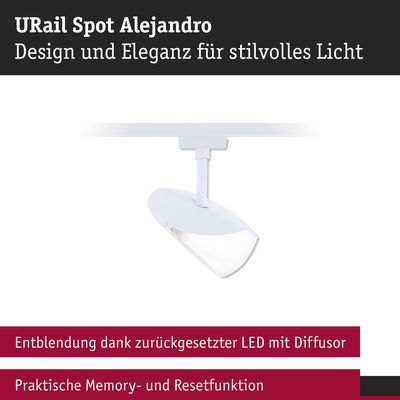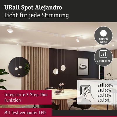 Der URail Spot Alejandro in Signalweiß ist ein Blickfang an Wand oder Decke und wertet mit dem stilvollen Design den Raum auf. Die 3-Step-Dim Funktion ermöglicht eine einfache Lichtsteuerung mit dem vorhandenen Wandschalter, ohne dass ein zusätzlicher Wanddimmer benötigt wird. Mit den Dimmstufen von 100%, 50% und 25% bietet der Spot eine flexible Lichtsteuerung, die für jede Stimmung und Situation geeignet ist. Die 4000 Kelvin sorgen für ein angenehmes neutralweißes Licht, das den Raum optimal ausleuchtet. Dank des versenkten LED-Chips mit Diffusor wird das Licht blendfrei und gleichmäßig verteilt, was für eine angenehme Atmosphäre sorgt. Besonders praktisch ist die Memory- und Resetfunktion, die es ermöglicht, die zuletzt eingestellte Helligkeit beizubehalten oder bei Bedarf zurückzusetzen. Das Design des Spots verleiht jedem Raum eine gewisse Eleganz und setzt stilvolle Akzente.