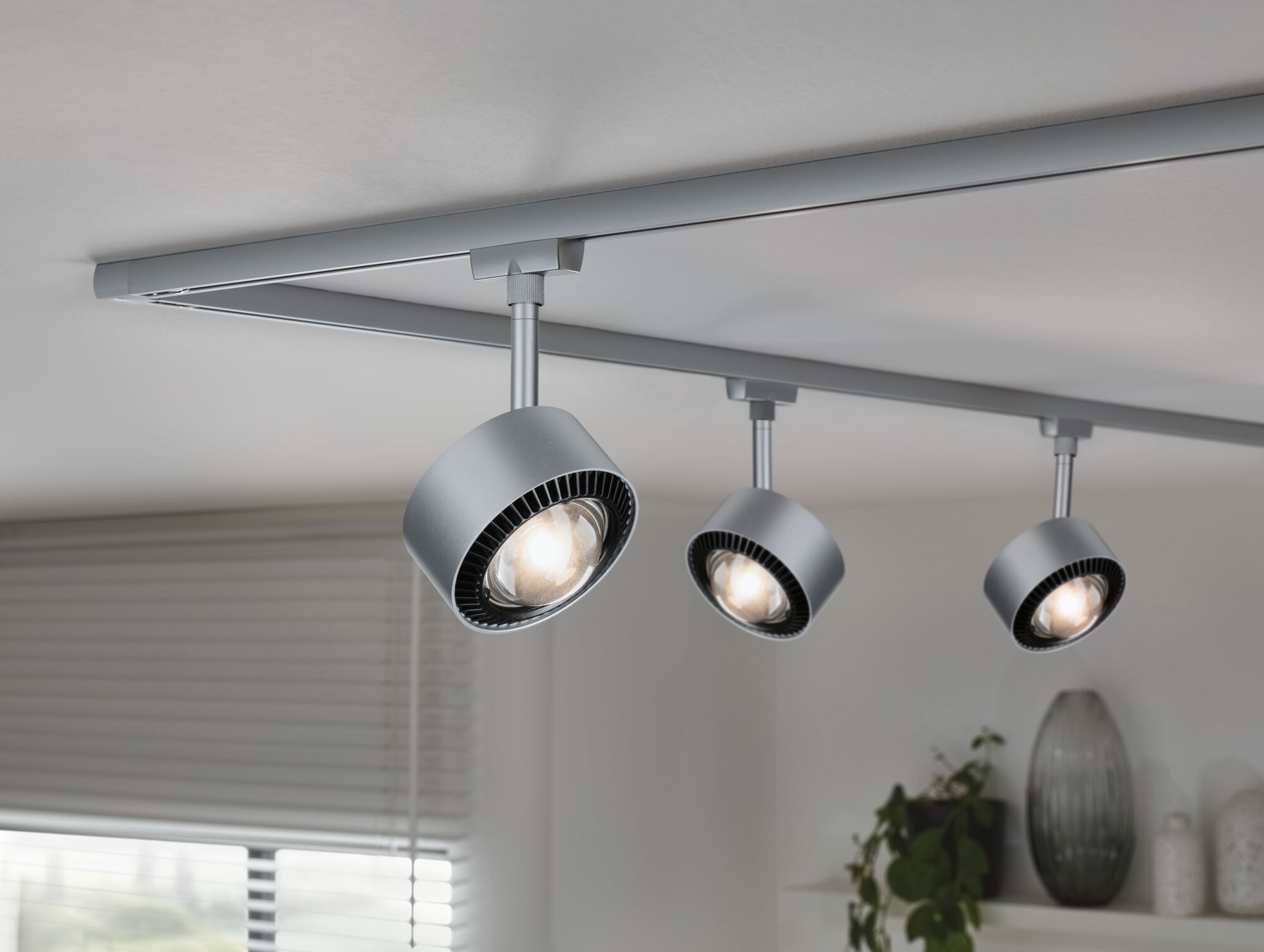 Der URail Spot Aldan in Chrom matt verbindet moderne Technik mit elegantem Design. Er lässt sich nach Bedarf ausrichten und bringt das Licht genau dorthin, wo es benötigt wird. Dank integrierter WhiteSwitch-Funktion lässt sich die Lichtfarbe durch mehrmaliges Betätigen eines handelsüblichen Lichtschalters in zwei Stufen einstellen. Mit dem URail 1-Phasen-Schienensystem lassen sich mit nur einer Schiene zwei verschiedene Beleuchtungsszenarien innerhalb eines Raumes realisieren.