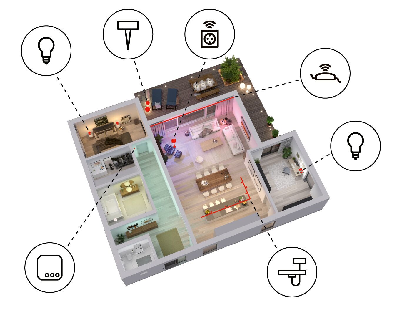 - Smarte Unterputzaktoren – Diese kleinen Module werden unsichtbar hinter bestehenden Lichtschaltern oder Steckdosen verbaut und fügen smarte Steuerungsfunktionen hinzu. Mit ihnen wird der dahinter liegende Stromkreis smart steuerbar.